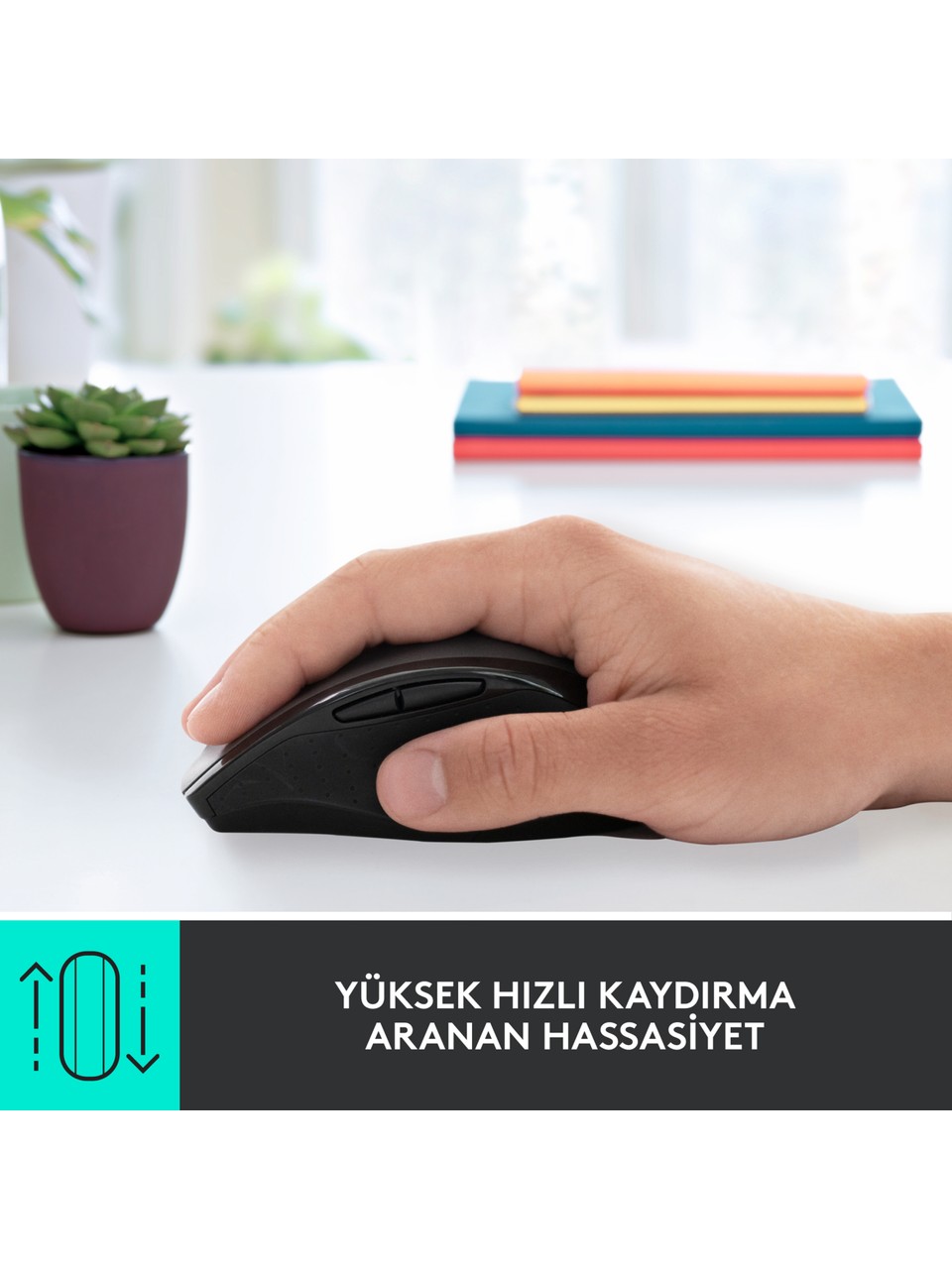 Çift modlu kaydırma ve daha fazla kontrol özellikleri ile uzun süreli kullanım için tasarlanan hassas mouse'un 3 yıla kadar etkileyici pil ömrü vardır. Hız ve hassasiyet arasında geçiş yapmanızı sağlayan çift modlu kaydırma özelliği ile satır satır izleme özelliği vardır. Tek tıklamayla modu değiştirebilirsiniz. 1000 DPI’da üstün imleç kontrolü sunar. Elinizin doğal kıvrımına uygun tam boyutlu ve yuvarlak hatlı şekil ile uzun süre kullanabilirsiniz. Sağ elle kullanıma yönelik tasarımda konforu arttırmak için kauçuk yan kavrama yerleri eklenmiştir. Sabit Unifying USB alıcı sayesinde güçlü ve güvenilir bağlantı 10 metreye kadar kablosuz özgürlük sunar. macOS ve Windows ile uyumludur. Ayrıca Works with Chromebook onaylı bir üründür. Başparmak kontrolleri dahil olmak üzere beş tuşunu da özelleştirmek ve veriminizi arttıracak kısayollar oluşturmak için Logitech Options yazılımını kullanabilirsiniz.